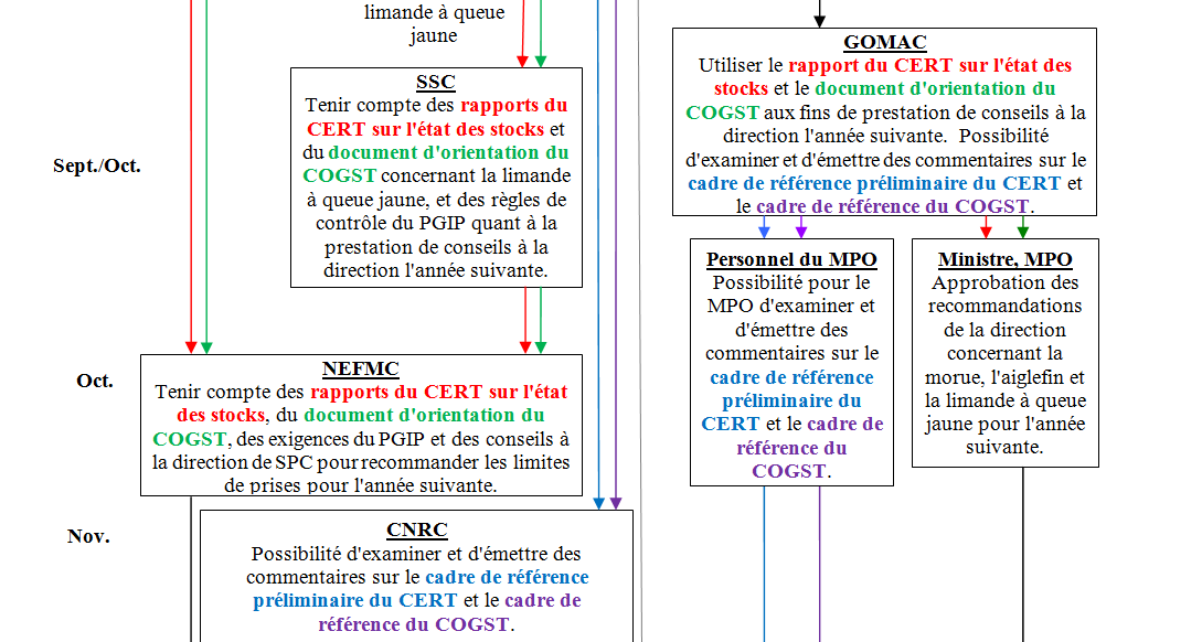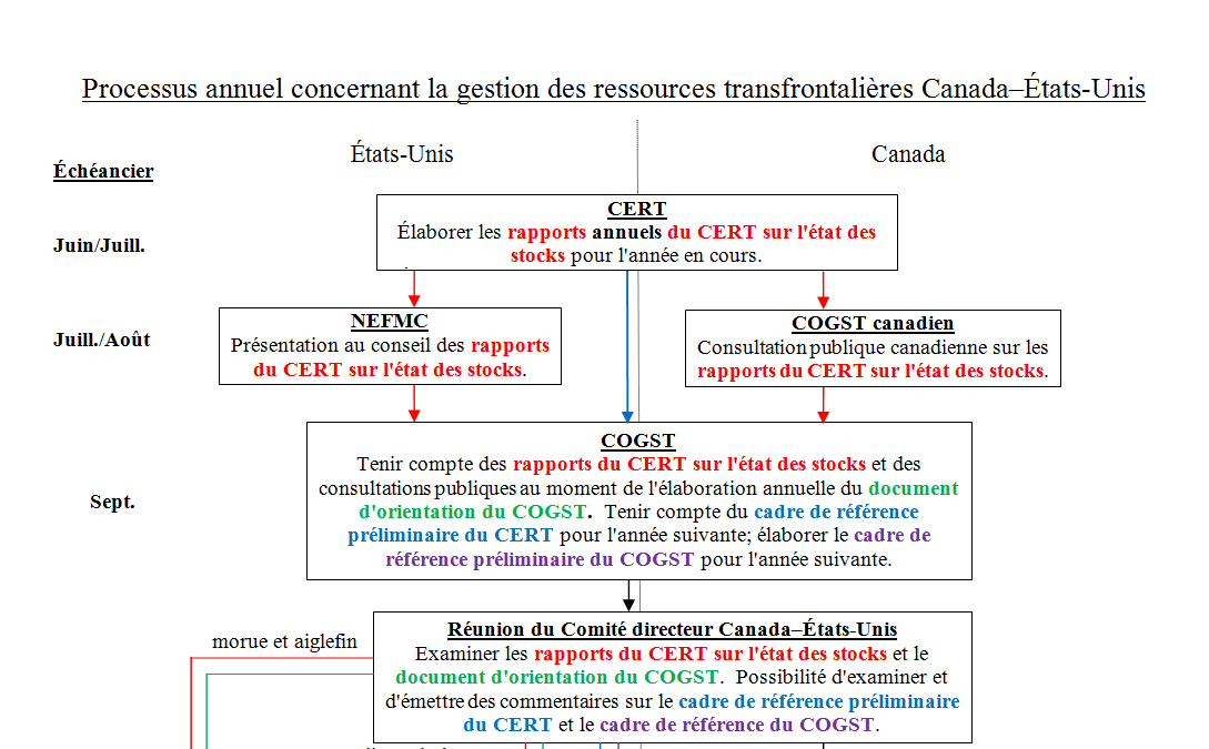 Le mode de fonctionnement adopté par le COGST, lors des consultations qu'il a tenues en 2002, pour fixer et appliquer les niveaux de capture annuels et pour prendre les mesures de gestion des stocks transfrontaliers de morue, d'aiglefin et de limande à queue jaune du banc Georges est décrit dans l'organigramme.