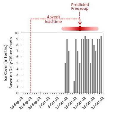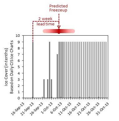 Real time data from the observatory, combined with knowledge gained from previous long-term monitoring in the area, has allowed us to provide accurate freeze-up forecasts with lead times of 2 to 4 weeks. These ice forecasts, combined with the bi-hourly year round ice and ocean data, point to the value of real time observatories for marine and resource development activities in remote Arctic locations.